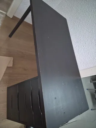 Mesa de escritorio con cajonera integrada. Su diseño combina funcionalidad y estilo. Precio en ikea 111€ - Estructura principal de madera. - Patas de metal. - Acabado en color negro y marrón.