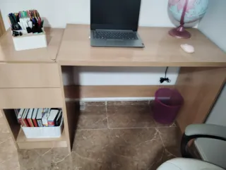 Escritorio funcional con un diseño moderno y práctico. - Amplia superficie de trabajo. - Múltiples cajones para almacenamiento. - Compartimento abierto. - Acabado en tonos madera. Lleva una grieta en un lateral pero no afecta para nada
