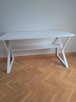 Práctico escritorio de Ikea, ideal para tu espacio de estudio u ordenador. Su diseño combina funcionalidad y estilo. - Estructura metálica resistente. - Superficie de trabajo en color blanco. - Estantes superiores para almacenamiento adicional.