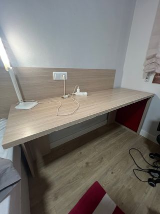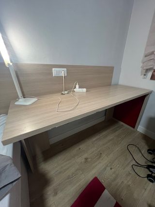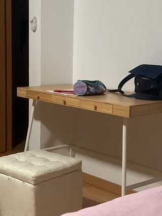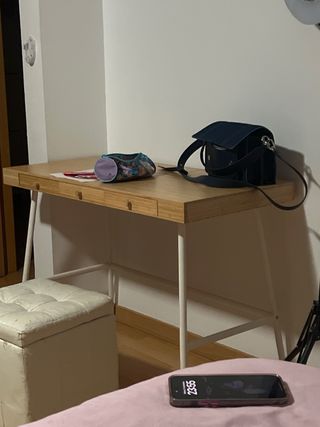 Escritorio amplio y muy funcional, ideal para estudiar, trabajar o usar como mesa de ordenador. Está como nuevo, sin arañazos ni marcas. ✅ Color madera clara, fácil de combinar con cualquier espacio ✅ Dos cajones amplios con tiradores de color Lila ✅ Espacio extra encima de los cajones para guardar libros, carpetas o material de oficina ✅ Estructura sólida y estable Perfecto para dormitorio, oficina o habitación juvenil. 📏 Medidas aproximadas: 120 cm de ancho x 60 cm de fondo x 75 cm de alto 📍 Recogida en mano