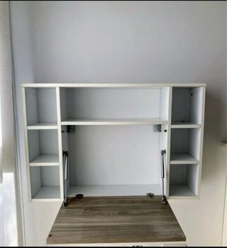 Escritorio compacto que se pliega y se monta en la pared. - Diseño moderno y funcional. - Ideal para espacios reducidos. - Fácil de abrir y cerrar.