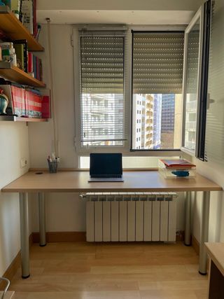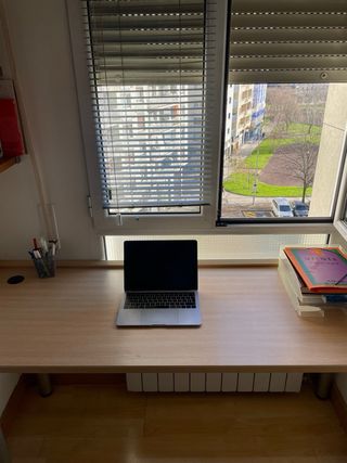 Mesa de escritorio como nueva. Tablero de madera clara y estructura metálica blanca. Hueco para dos pantallas sin problemas. El fondo de 80 perfecto para tener espacio para diferentes auxiliares. Incluye bandeja trasera para organizar cables. 1 año de uso esporádico. Como nueva. Se entrega en mano.