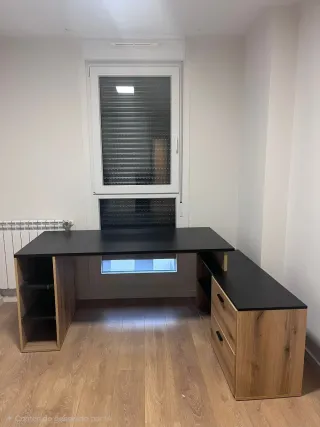 Escritorio en forma de L con un diseño moderno y funcional (dos unidades) - Superficie de trabajo espaciosa. - Combinación de colores negro y madera. - Incluye cajonera con dos cajones. - Estanterías integradas para almacenamiento. Medidas Tablero superior 80×160 Tablero lateral 40x121 Cajonera 56.6x60
