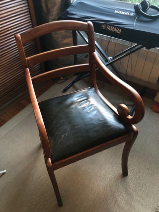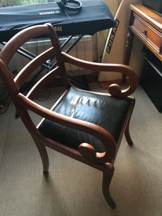 Elegante escritorio antiguo. _ Estilo ingles. - Tres cajones frontales con tiradores. - Patas torneadas y robustas. - Acabado en madera con detalles en negro. _ Encimera de piel color negro. Dimensiones: Ancho 135cm. Alto 79cm. Fondo 66cm. Amplia superficie de trabajo así como cajones de gran capacidad. La mesa es consistente pero dos de las patas necesitan un pequeño arreglo con cola así que yo tengo el mueble sujeto a la pared con dospequeños soportes. Madera sana.