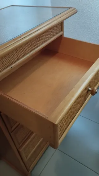 Elegante escritorio con una combinación de materiales que le da un toque único. - Estructura principal de madera. - Detalles en mimbre. - Acabado en tonos marrones y multicolor. HAY MÁS COSAS EN MÍ PERFIL