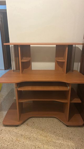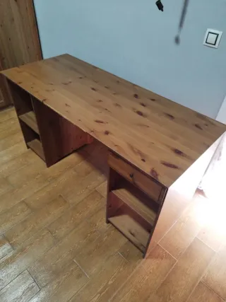 Escritorio de madera resistente y robusta, ideal para estudio u oficina. Diseño amplio y funcional con cajonera integrada de 4 cajones grandes, todos operativos y con buen espacio de almacenaje. Estructura sólida y estable, pensada para soportar peso y uso diario sin problemas. Incluye mueble auxiliar para PC o almacenaje con 2 compartimentos. Es de otro tono de madera, pero combina bien con el conjunto. -Medidas escritorio: 120 x 73 x 80 cm. -Medidas mueble auxiliar: 70 x 32 x 43 cm. Presenta ligeras marcas de uso normales. Uno de los cajones tiene cerradura no funcional, sin afectar al uso. Se entrega montado.