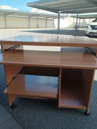 Escritorio funcional con espacio para teclado e impresora. No incluye la impresora que sale en la foto. Sus dimensiones son 135x48x80 cm. Está pintado, su color original era marrón oscuro. Necesitaría un pintado del color que prefiera. Fácil de hacer. - Cajón de madera. - Bandeja extraíble para teclado. - Compartimento inferior con puertas. No envío ni transporto. Debe ser recogido en mi domicilio.