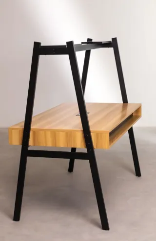 Escritorio moderno con estructura de acero negro y tablero de melamina en tono madera. - Diseño contemporáneo con líneas limpias. - Combinación de materiales que aportan calidez y robustez. - Espacio de trabajo funcional y estético.