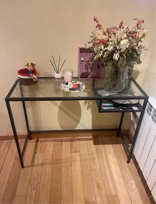 Elegante mesa de escritorio o aparador con un diseño moderno. Ikea VITTSJÖ - Tablero de cristal. - Estructura de metal. - tabla baja en negro