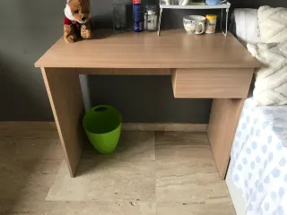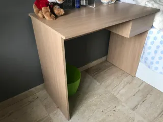 Escritorio básico de aglomerado de madera. Tiene un desconchón en una esquina interior - Diseño sencillo y funcional. - Acabado en tonos beige ,mide 90 ancho 50 fondo y 75 alto