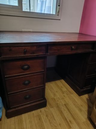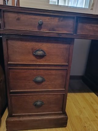 Escritorio-mostrador Victoriano en caoba maciza tallada a mano, S. XIX. 3 piezas, tablero con 3 cajones a ambos lados y 2 bases soporte del tablero, a un lado de los pies 3 cajones en cada uno,total 6, a otro lado 2 armarios independientes, gran capacidad,en el tablero señales de uso, escucho ofertas lógicas, necesito espacio urgente, adjunto foto de escritorio dimensión: tablero 1'40 x 0'80, cajoneras alto 0'70 x profundidad 0'70 x ancho 0'40 cmts., más objetos interesantes en mi perfil, urge vender por espacio, sólo entrega en persona, muebles para toda la vida. #mostrador #escritorio #macizo #caoba #victoriano #mueble