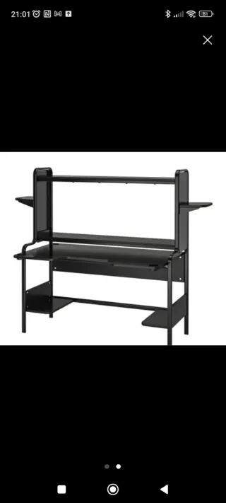Escritorio de estilo gaming con un diseño moderno y funcional. Ideal para crear tu espacio de juego o trabajo. - Estructura robusta de metal. - Acabado en color negro. - Múltiples niveles de estanterías para almacenamiento.