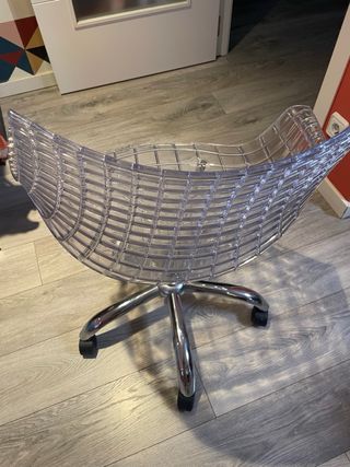 Silla de escritorio con un diseño moderno y elegante. - Base de cinco patas con ruedas. - Asiento y respaldo de plástico transparente. - Estructura y patas de metal plateado.