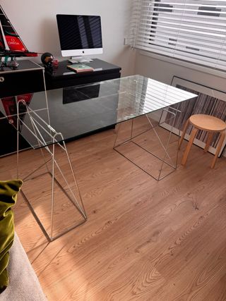 Elegante escritorio con un diseño moderno y minimalista. - Superficie de cristal. - Estructura de metal. Largo 140 cm, ancho 70 cm, alto 77 cm SOLO RECOGIDA