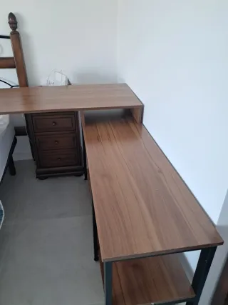 Escritorio en forma de L. - Superficie de melamina color madera con acabado veteado. - Estructura metálica resistente. - 2 estantes inferiores. Las 2 superficies de trabajo miden 130 cm de largo. La superior tiene 48 cm de ancho y la inferior 36. Se entrega como en la última foto.