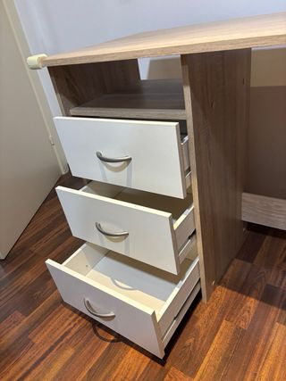 Práctico escritorio de madera con un diseño funcional. Cuenta con espacio de almacenamiento integrado. - Tres cajones con tiradores. - Compartimento abierto. - Acabado en tonos beige y marrón. No incluye silla. Se recoge por Esplugues de Llobregat (centro).