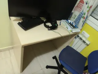 Silla de oficina ergonómica con un diseño moderno. - Respaldo y asiento acolchados. - Reposabrazos metálicos. - Base con ruedas para fácil movilidad. Escritorio blanco - Con bandeja extraíble Las dos cosas 35€ Escritorio: 15€ Silla: 30€