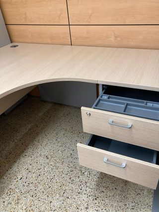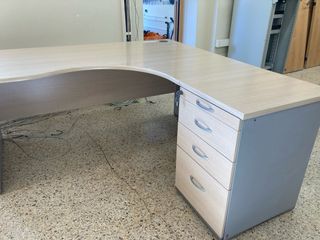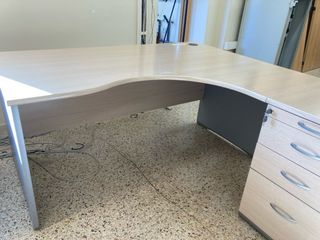 Mesa de oficina en forma de L con un diseño moderno y funcional. - Superficie de madera en tono claro. - Cajonera con tres cajones. - Llave incluida para la cerradura del primer cajón. Medidad de 1,60x1,67cm
