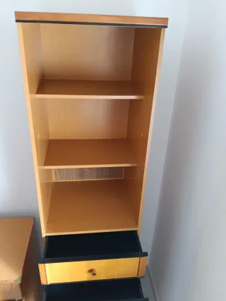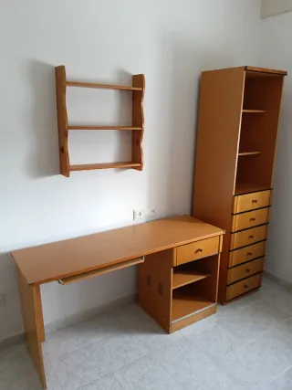 Conjunto de escritorio, silla de ordenador, y repisa a juego. - Escritorio con diseño de cajones y compartimentos. - Silla de ordenador con ruedas, regulable. - Medidas ancho escritorio 106cms, fondo 39 y alto 75cms. Y repisa a juego 3 estantes de madera maciza.