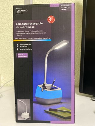 Lámpara de escritorio recargable con brazo flexible y base con compartimentos para organizar tus útiles. - Ajuste de 7 colores de luz diferentes. - Funcionamiento con batería para mayor flexibilidad. - Temperatura de color: aprox. 3000/4500/6500 K (blanco cálido-blanco frío). - Batería de iones de litio de 3,7V (2 Ah). - Flujo luminoso: aprox. 300/150/30 lm.