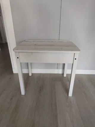 Mesa de escritorio con un diseño clásico y funcional. Su acabado en madera le da un toque acogedor a cualquier espacio. - Patas estables para mayor seguridad. - Superficie lisa y fácil de limpiar. - La parte de la tabla hay que pintar o lijar, yo lo hago por 5€ más. - Precio original 69,99€.