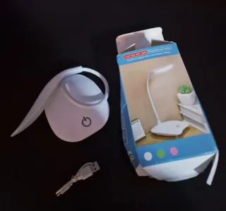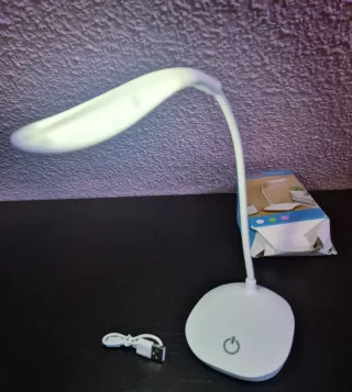 Lámpara de escritorio LED, ideal para lectura o trabajo. Su diseño es moderno y funcional Luz suave para proteger la vista Ajuste táctil de luminosidad, 3 modos Incluye cable de carga USB Embalaje deteriorado