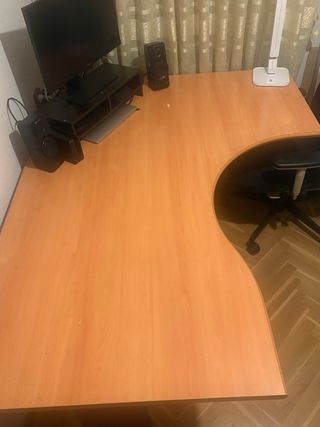 Escritorio de diseño moderno y funcional. Robusto y muy estable. Está en genial lo vendo por cambios en casa, pero es un escritorio para toda la vida. - Forma de L. - Superficie de madera, color roble. - Patas metálicas. - medidas 160*80/120*60