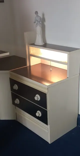 Conjunto de mueble de habitación con escritorio y mesita de noche a juego, incluida la esquinera. Cuatro amplios cajones. Ambos módulos con luz independiente. Medidas escritorio 100 cm. Largo x 164 alto x 38 fondo. Mesita: 51 x 73 x 38