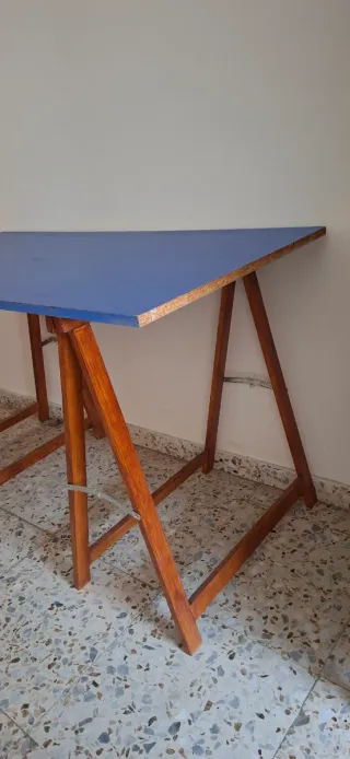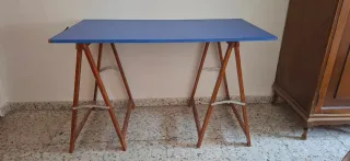 Mesa con tablero azul y caballetes madera. *Tablero lamunado azul, habría que reparar los cantos.