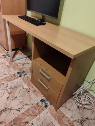 Escritorio de madera bien conservado, con un cajón extraíble. Lo tengo desmontado porque lo tengo guardado en el altillo porque no me cabe en el piso nuevo - Diseño funcional y práctico. - Acabado en tono madera natural.
