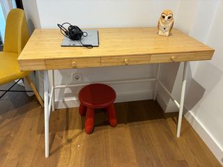 Mesa muy bien conservada y funcional con espacio para que su uso sea cómodo. Con la mesa se adjunta cajonera de tres cajones a juego y el aplique u extensión de la mesa con acabado redondeado. Faltan algunos tornillos para anclar la mesa en el soporte (los cuales se pueden obtener facilment por internet si quieres los originales de ikea o ferreteria) es por esta razon que el precio del lote es tan ajustado. Por lo demas todo perfecto.