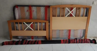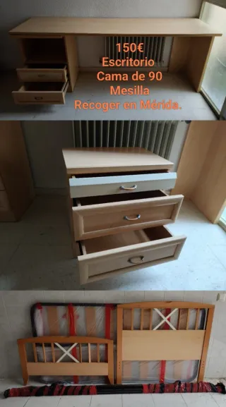 Conjunto de dormitorio de madera de pino. Compuesto de : -Cama de 105 x 195 cm, incluye somier de laminas y colchón, Medidas del colchón 180 cm. Todo 110€ - Escritorio con cajones 45€. Medidas 98x75 cm - Silla 15€ - Espejo 15€. Medidas 87x64 cm. Recogida en Mérida