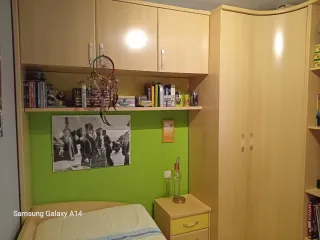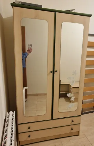 Armario juvenil de madera clara con detalles en verde. - Dos puertas con espejos. - Dos cajones inferiores. - Tiradores redondos. 2 cabeceros iguales 2 somier de lamas 1 escritorio 1 estanteria para colgar en pared 1 mesilla Todo a juego