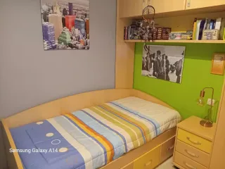 Conjunto de muebles para dormitorio infantil o juvenil. - Armario de madera clara con puertas. - Estantería superior con compartimentos. - Escritorio con cajones. - 2 cajoneras - Cama con somier y cajones. Desmontaje, envío y traslado a cargo del comprador. Solo venta en persona. Precio negociable.