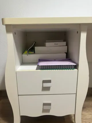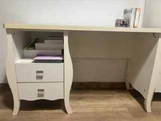 Elegante escritorio de madera maciza con un acabado blanco, está pintado, no lacado. - Diseño clásico con patas curvas. - cuatro cajones con tiradores redondos, en la foto son color miel pero tengo 4 negros que quedan bastante bien. - Encimera espaciosa.