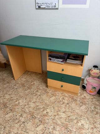 Escritorio funcional con un diseño moderno. - Superficie amplia en color verde. - Cajonera con tres cajones. - Patas de madera resistentes.