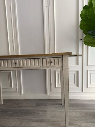 Elegante escritorio de madera con un diseño clásico y funcional. - Encimera de madera con acabado natural. - Tres cajones frontales con detalle tallado. - Patas cónicas estilizadas. - Combinación de colores blanco y marrón. 110x56 , alto 81.5