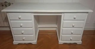 Escritorio de madera pintado en blanco, con un diseño clásico y funcional. - Ocho cajones para almacenamiento. - Tiradores redondos. - Amplia superficie de trabajo. - Medidas : 148x58x76
