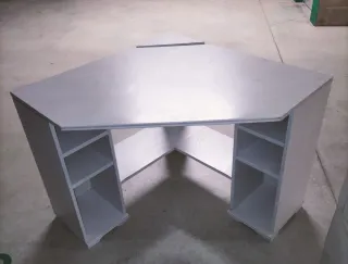 Escritorio blanco de madera para esquina. Aunque tiene marcas de uso, está en buen estado y funcional. Lo entrego semi-desmontado o montado, como se prefiera. Para recoger en Barañain.