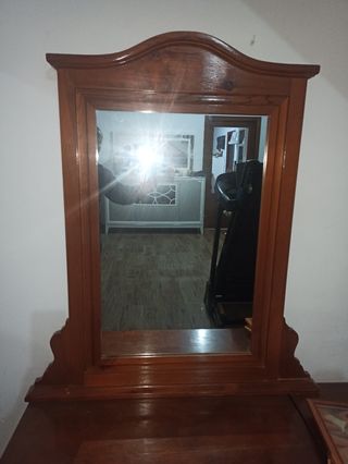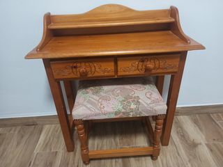 escritorio de madera maciza con banqueta a juego, tallado y en perfecto estado, ver sin compromiso,con espejo a juego si se desea, precio del espejo aparte 20 eur mas, estilo provenzal, color miel, el espejo es del mismo color, en la foto parece más oscuro por la luz