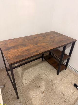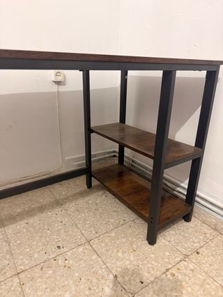 Escritorio moderno con un diseño industrial y práctico. - Tablero con acabado imitación madera. - Estructura metálica negra. - Dos baldas integradas para almacenamiento.