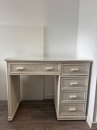 ESCUCHA OFERTA RAZONABLES (no regalo, no es gratis) Elegante escritorio de mimbre en color blanco, con superficie superior de cristal. Diseño de mimbre tejido, con tiradores y remates efecto bambú. Encimera de cristal. Cajones integrados, 4 pequeños laterales (derecha) y uno grande a la izquierda centrado. Medidas aprox.: 99 x 48 x 78 cm (ancho, fondo, alto) Tiene uso y algunas marcas, como se ve en las fotos. Tengo otro mueble de mimbre en color beige o marrón, por si quieres hacer lote Puedo hacer portes (transporte de muebles), consulta precio total