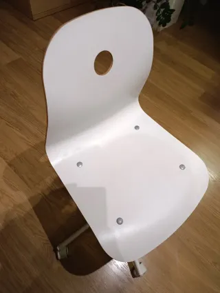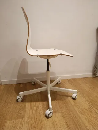Silla de escritorio de la marca Ikea. - Asiento y respaldo perforados. - Base con ruedas para fácil movilidad. - Ajustable en altura - Ruedas compradas aparte de goma silenciosas y antirayaduras