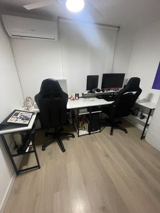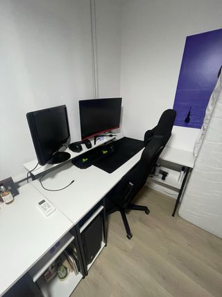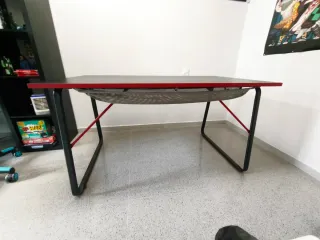 Escritorio gaming marca Kimenich. El color es madera como se ve en la ultima foto, pero en esa el modelo no es el mismo. Yo lo uso y me encanta, lo vendo nuevo en la caja porque el proveedor me mandó 2 por error. Vale 150€ online. Escritorio moderno con diseño para gaming. Cuenta con una estructura robusta y un acabado elegante. - Superficie amplia para equipo. - Estante superior para monitor y accesorios. - Cajonera lateral integrada. - Compartimento para torre de PC. - Soporte para auriculares.