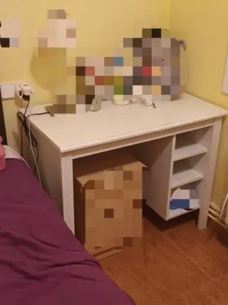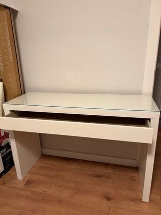 Se vende escritorio IKEA MICKE en color blanco, práctico y funcional. Dispone de salida para cables en la parte trasera, perfecta para mantener el escritorio ordenado. Incluye cajón y armario con balda regulable, que puede montarse a la derecha o a la izquierda según el espacio. La parte trasera tiene apertura para ventilación, ideal para ordenador u otros dispositivos. Escritorio estable, resistente y bien cuidado, ideal para dormitorio, despacho u oficina en casa. Medidas: 105 × 50 × 75 cm. Se vende por mudanza