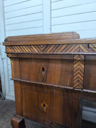 Instagram janoradeco Espectacular pieza. Gran calidad. Este es un antiguo escritorio, buró o canterano con un diseño clásico. Gran trabajo de marquetería. Señales de uso. Medidas. 122 x 59 y 120 de alto. Abierto 97 de fondo. - Elaborado en madera con detalles de marquetería. - Presenta herrajes metálicos.