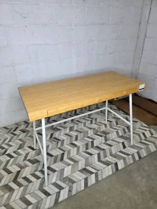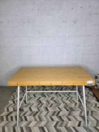 Elegante escritorio de estilo nórdico, de la marca IKEA, tablero en material de bambú, patas y estructura metálica, tres cajones de almacenamiento, con un diseño funcional, ideal para darle un toque moderno a tus espacios. 103cm ancho x 49cm fondo x 74cm altura