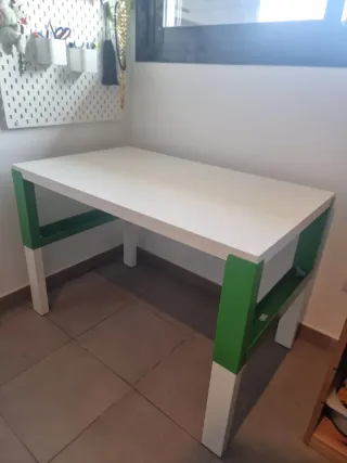 Escritorio moderno con un diseño juvenil y llamativo. Ideal para espacios de estudio o trabajo. - Combinación de colores blanco y verde. - Estructura robusta. Se puede ajustar la altura en 3 posiciones: -Máxima: 72cm -Media: 66cm -Minima: 59cm Los pernos de las patas permiten regular a estas medidas Las bandejas que hay entre las patas delanteras y traseras te ayudan a tener los cables y las regletas en orden. Silla a conjunto del escritorio Disponible estantería a conjunto de 3 baldas, pendiente subir fotos