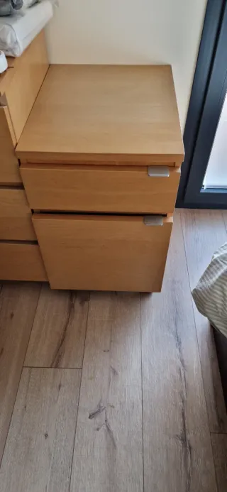 Conjunto de escritorio con superficie de madera y cajonera. - Patas metálicas. - Cajonera de plástico. - Diseño funcional. La cajonera la parte de archivador no cierra del todo.