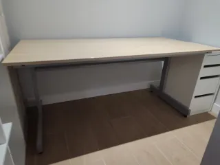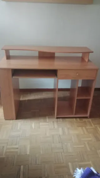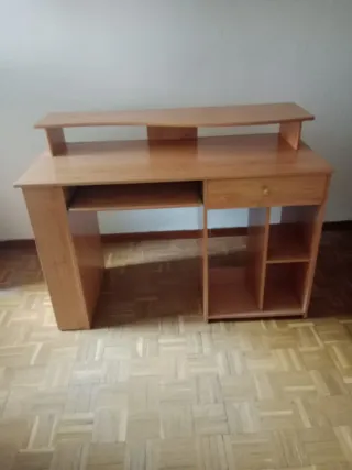 Està en muy buen estado. Tiene un defecto pequeño en la tabla principal pero es de montaje de fabrica, no del uso. NO es de Ikea. Es de "tienda de barrio". Es de muy buena calidad y robusto. - Amplia superficie de trabajo. - Un cajón con tirador para almacenamiento. - Compartimentos abiertos para organizar objetos. - Bandeja para teclado. Railes de cajò y bandeja perfectos. Cualquier duda, sin compromiso pregúntame.